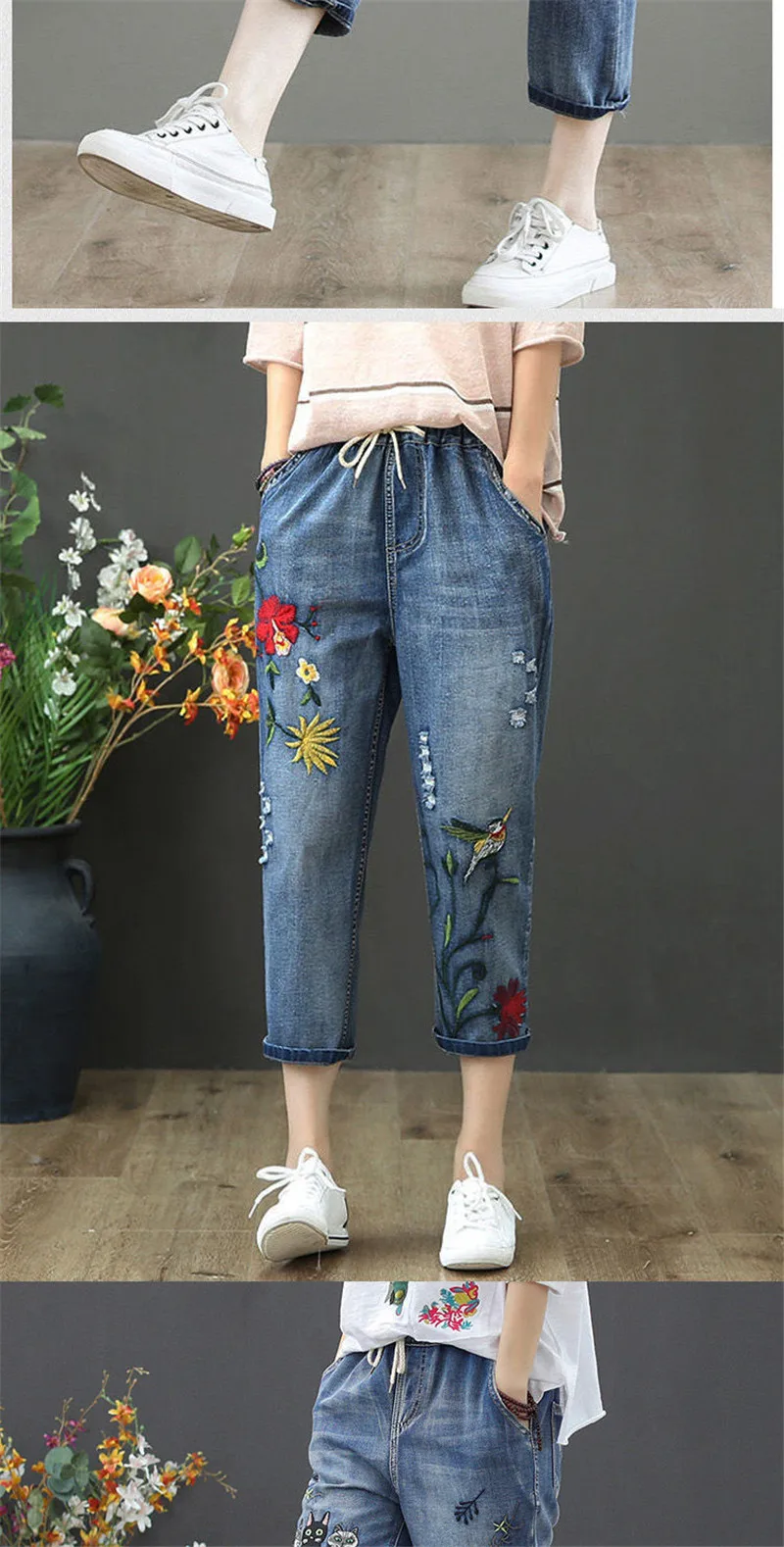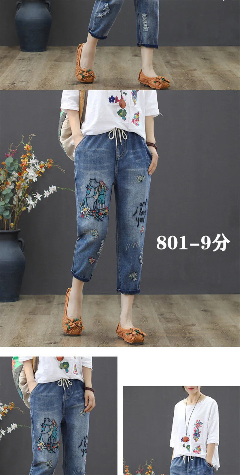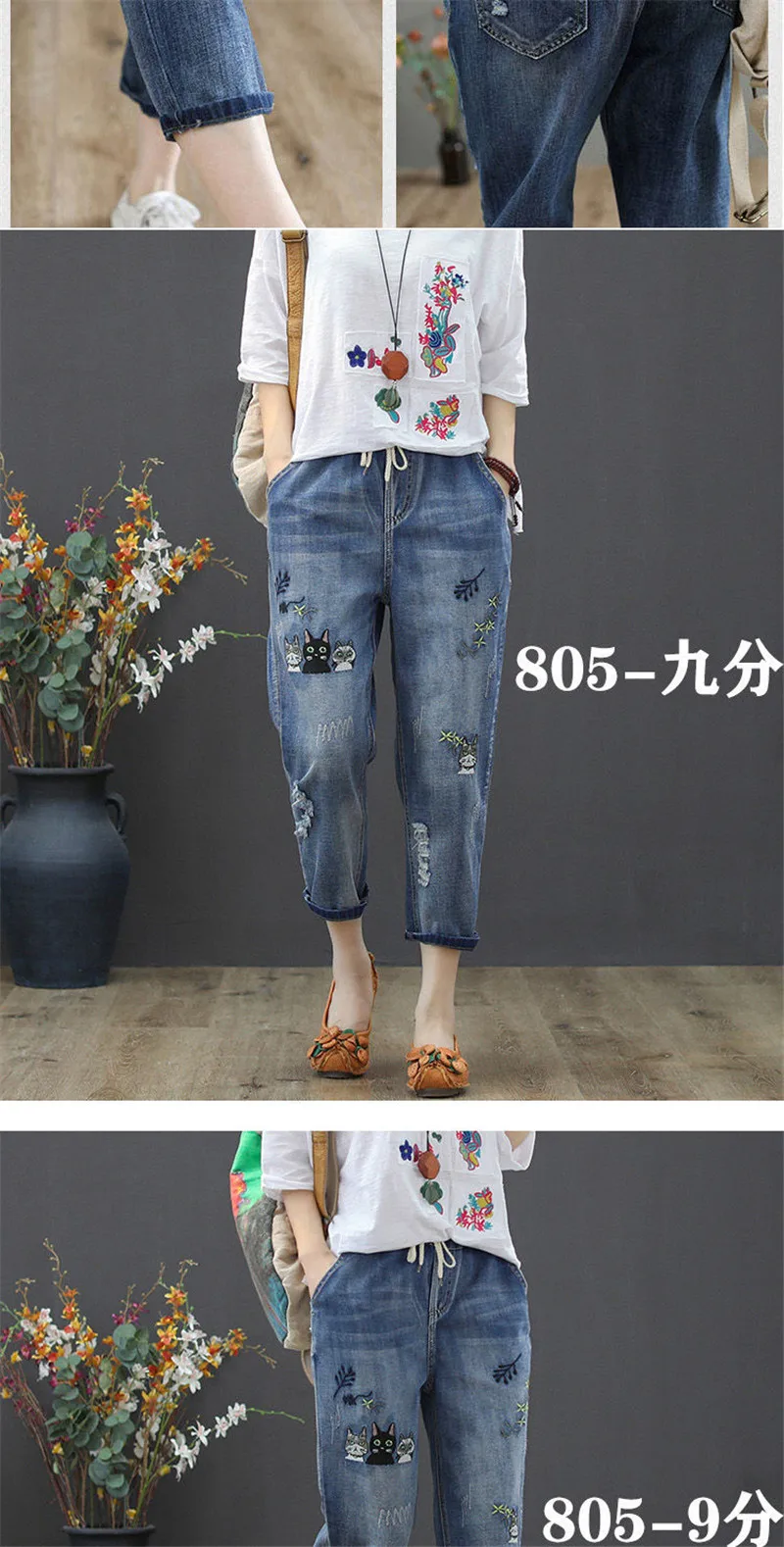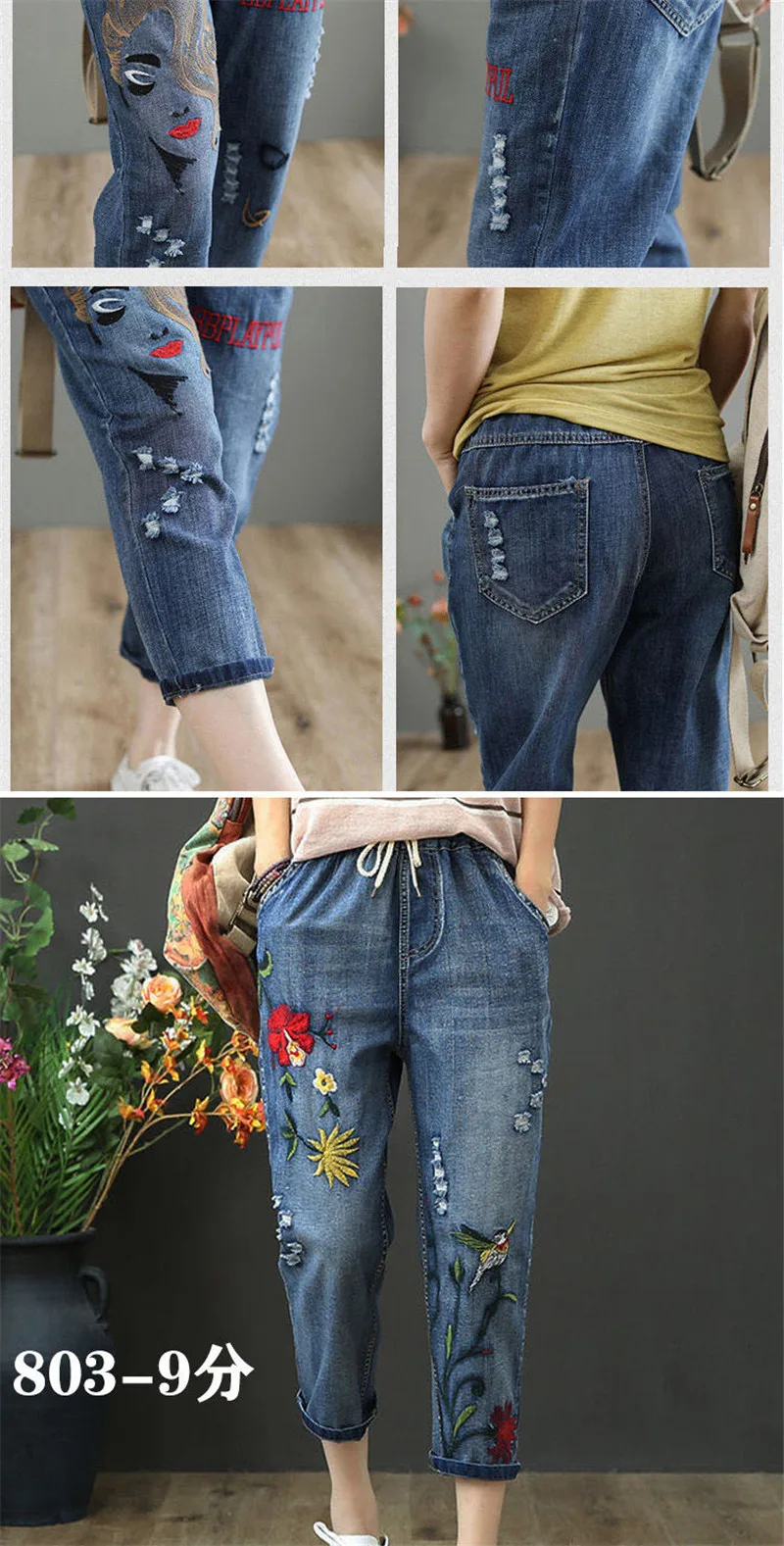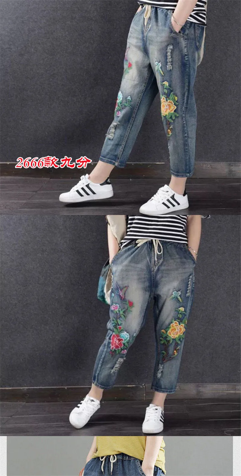 Jeans High Waist Women Retro Straight Trousers For Female Ankle Length Pants Elastic Waist Harem Pant Hole Embroidered Jeans