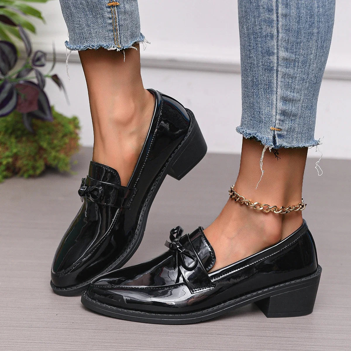PU Leather Women's Shoes 2025 Spring Pointed Toe Slip-on Women's Casual Loafers Elegant Bow Office Med Heel Shoes Zapatos Mujer