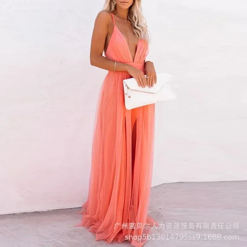 Women's Evening Party High Waist Floor Length Sexy Dress Orange Sleeveless Backless Gauze Long Dress